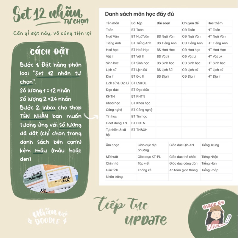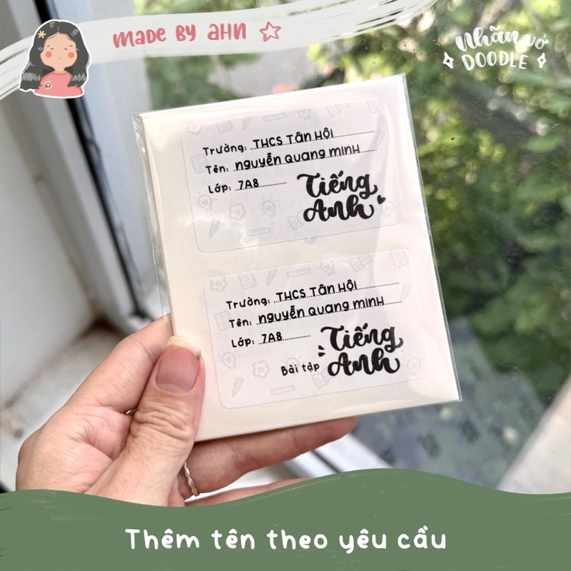 |NEW 2025| Nhãn vở DOODLE môn học đầy đủ từ lớp 1 đến 12 - In tên theo yêu cầu - MADE BY AHN thiết kế —— ❌Cách mua nhãn THÊM TÊN: 👉B1: Đặt hàng phân loại có “thêm tên” 👉B2: Inbox cho shop thông tin Trường/Tên/Lớp (hoặc note trực tiếp trong đơn) ❌Nếu ko có thông tin, mình ko thể in nhãn cho bạn. Sau 24h không nhận được thông tin từ bạn, Ahn xin phép gửi nhãn thường cho bạn để kịp giao đơn cho vận chuyển. Mong bạn thông cảm! —— ❌Cách mua 12 nhãn tự chọn: 👉B1: Đặt hàng phân loại "Set 12 nhãn tự chọn" 👉B2: Inbox cho shop 12 nhãn bạn muốn mua (chỉ chọn trong danh sách đính kèm trên ảnh sản phẩm) kèm màu sắc (colorful hoặc black) ❌Nếu ko gửi danh sách nhãn, Ahn ko thể gửi hàng cho bạn nên đặt hàng xong thì inbox cho Ahn ngay nhá! —— ❌THÔNG TIN SẢN PHẨM - Số lượng: Tùy thuộc vào mỗi lớp (bạn xem ảnh sản phẩm để biết rõ hơn nhé) - Kích thước 1 nhãn: 4x7cm - Chất liệu: Decal hơi bóng, kháng nước tương đối. —— ❌LƯU Ý - Sticker đã được cắt sẵn, bạn mua về chỉ cần bóc ra và dán. - Tốt nhất không nên để sticker tiếp xúc với nước. - Bạn nhận hàng nếu có không hài lòng với sản phẩm, vui lòng inbox cho MADE BY AHN, chúng mình sẽ hỗ trợ bạn! CÁM ƠN BẠN NHIỀUUUU ❤️