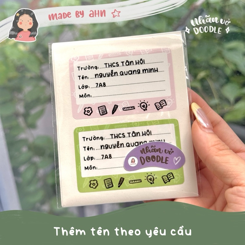 |NEW 2025| Set 12 Nhãn vở DOODLE (không môn) Bộ nhãn vở thiết kế xinh xắn với phong cách doodle hiện đại, màu sắc tươi sáng, giúp vở học thêm gọn gàng và cá tính. In tên riêng theo yêu cầu, phù hợp cho học sinh tiểu học, THCS, THPT hoặc làm quà tặng cuối năm học. MADE BY AHN – Tự tay thiết kế, dành riêng cho bạn! —— ❌Cách mua nhãn THÊM TÊN: 👉B1: Đặt hàng phân loại có “thêm tên” 👉B2: Inbox cho shop thông tin Trường/Tên/Lớp (hoặc note trực tiếp trong đơn) ❌Nếu ko có thông tin, mình ko thể in nhãn cho bạn. Sau 24h không nhận được thông tin từ bạn, Ahn xin phép gửi nhãn thường cho bạn để kịp giao đơn cho vận chuyển. Mong bạn thông cảm! —— ❌THÔNG TIN SẢN PHẨM - Số lượng: Tùy thuộc vào mỗi lớp (bạn xem ảnh sản phẩm để biết rõ hơn nhé) - Kích thước 1 nhãn: 4x7cm - Chất liệu: Decal hơi bóng, kháng nước tương đối. —— ❌LƯU Ý - Nhãn đã được cắt sẵn, bạn mua về chỉ cần bóc ra và dán. - Tốt nhất không nên để nhãn tiếp xúc với nước. - Bạn nhận hàng nếu có không hài lòng với sản phẩm, vui lòng inbox cho MADE BY AHN, chúng mình sẽ hỗ trợ bạn! CÁM ƠN BẠN NHIỀUUUU ❤️