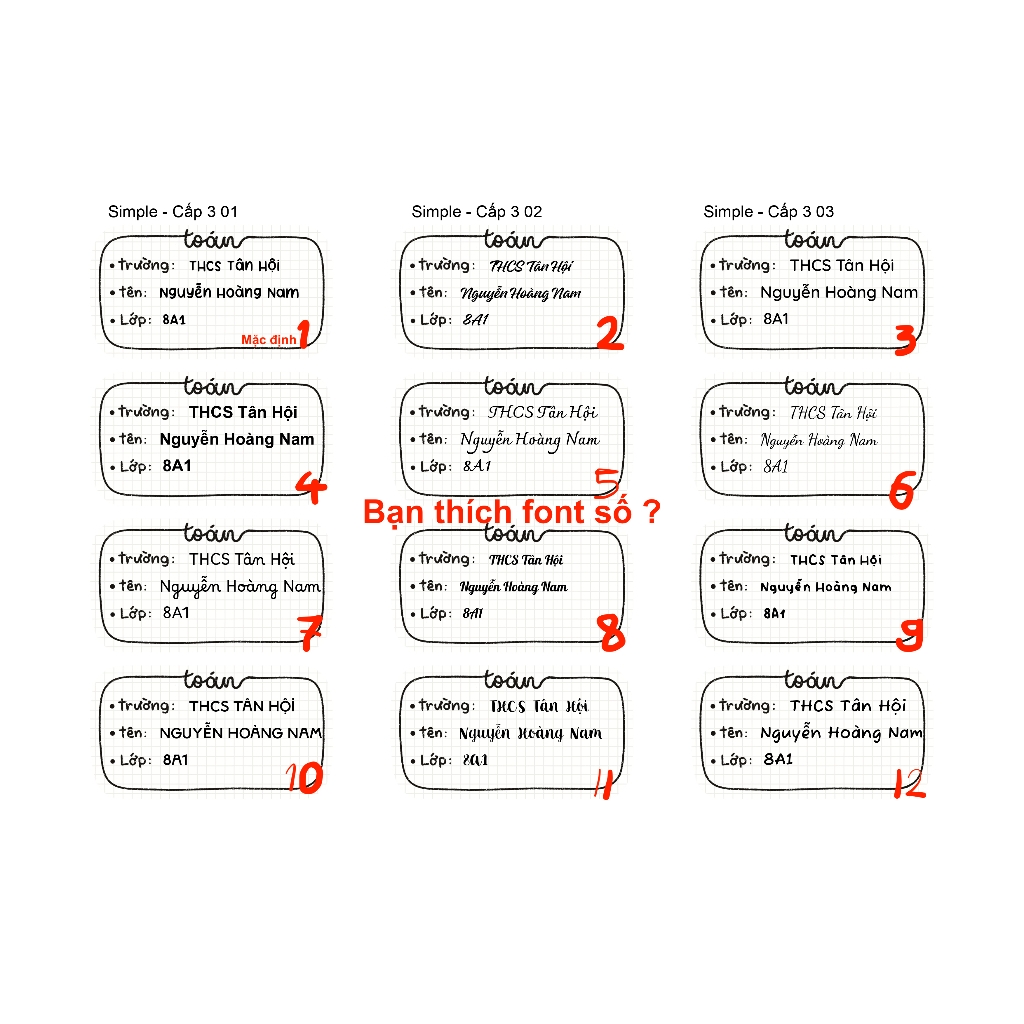 UPDADTED 2025: Với nhãn theo yêu cầu, các bạn có thể yêu cầu in màu viền và tên/trường/lớp theo 1 màu yêu cầu và chọn Font theo sở thích (xem ảnh cuối cùng của sản phẩm) Sau 1 năm lười biếng thì nay, Ahn đã có sản phẩm mới để khoe với cả nhà đây. Đó là em nhãn vở môn học 2023 với 3 đặc điểm: đơn giản, dễ thương, tiện lợi. Vì có nhiều bạn hỏi phiên bản nhãn môn học full đen nên lần này Ahn cho ra mắt đồng thời cả bản màu và bản đen cho các bạn tha hồ lựa chọn nha. Đặc biệt phiên bản màu đen tối giản này mà dán lên vở thì ta nói vừa xinh, vừa sang. Bề mặc giấy trơn bóng nhưng phù hợp với bất cứ loại bút nào, tuy nhiên bạn cần đợi mực thật khô rồi mới chạm tay vào nha. * CÁCH MUA NHÃN THÊM TÊN: B1: Bạn đặt hàng “Nhãn thêm tên” B2: Inbox cho shop thông tin về trường/tên/lớp để t ghi lên nhãn là xong rồi! THÔNG TIN CHI TIẾT *Chất liệu: decal bóng kháng nước tương đối *Kích thước: 7x4cm LƯU Ý * Bạn mua về chỉ cần bóc ra và dán * Viết được với mọi loại bút, tuy nhiên cần đợi mực thật khô rồi mới chạm tay vào * Set nhãn lớp 10,11 ct mới có 24 chiếc. Các lớp còn lại 20 chiếc. Cám ơn các bạn đã ghé! Còn bất kì câu hỏi gì về sản phẩm đừng ngần ngại mà hãy inbox cho Ahn ngay nha!