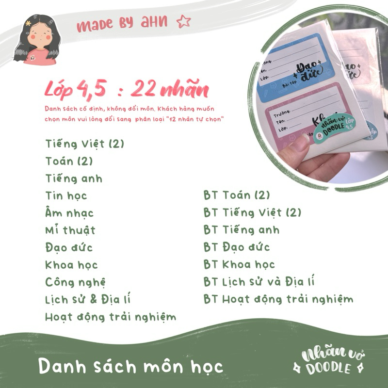 [NEW 2025] Nhãn vở DOODLE (môn học) đầy đủ từ lớp 1 đến 12 - In tên theo yêu cầu - MADE BY AHN thiết kế